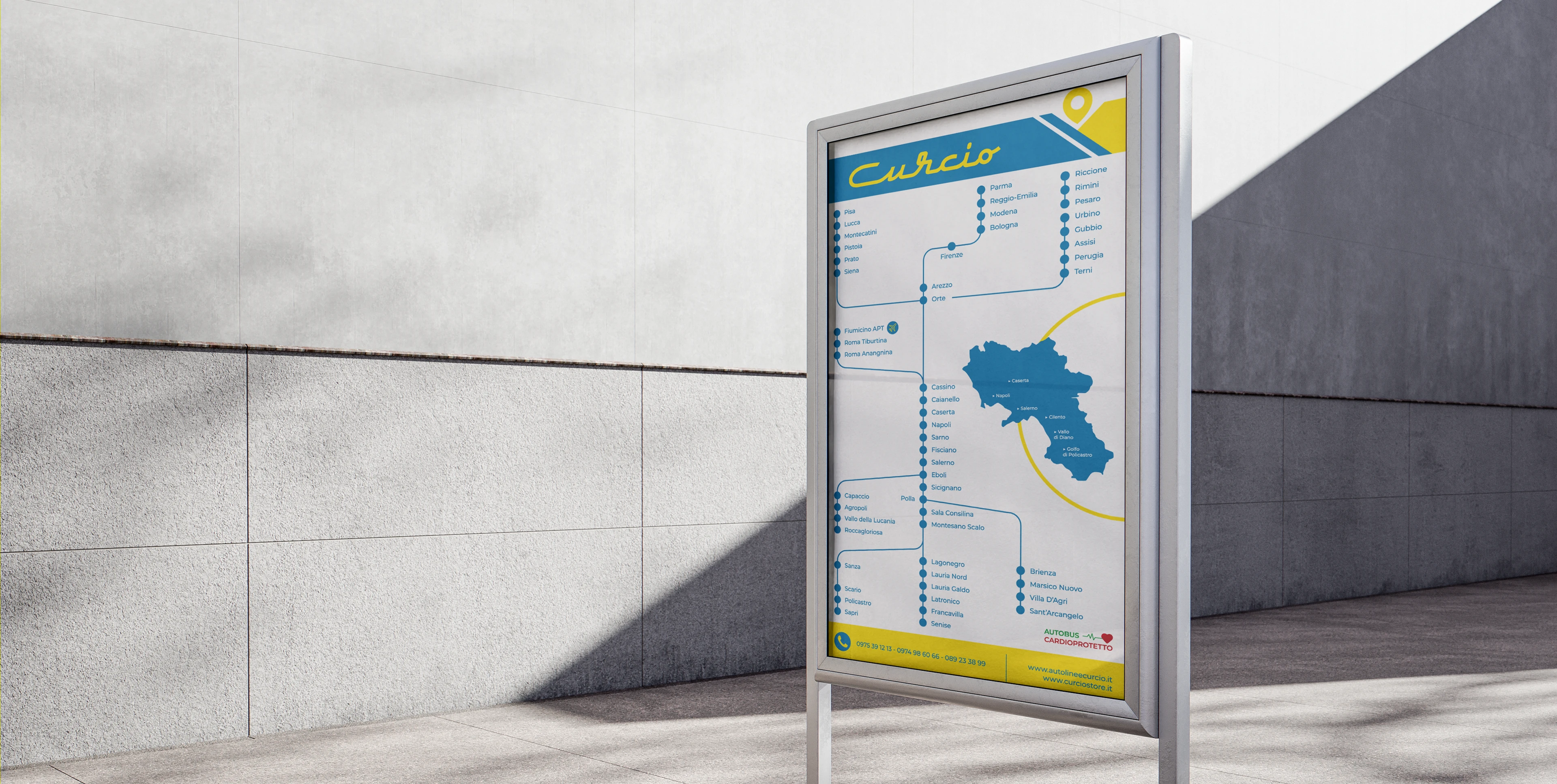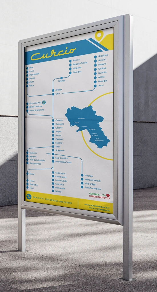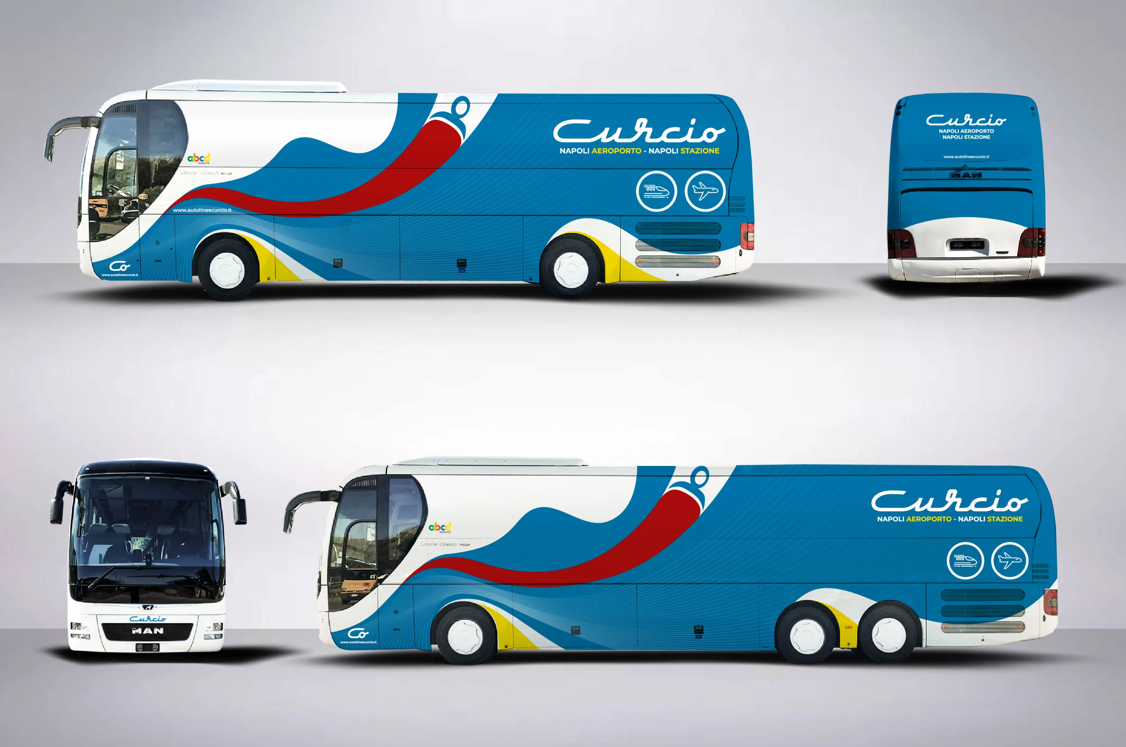 Progettazione e design per brandizzazione autobus per rafforzare la presenza visiva dell'azienda sui propri mezzi di trasporto. Il concept è stato pensato per promuovere le corse da e verso Napoli, con colori mediterranei e il tipico corno napoletano.Il design distintivo dei veicoli assicura un riconoscimento immediato del brand, contribuendo a diffondere l'immagine di Autolinee Curcio su tutto il territorio. La creazione di vetrofanie punta a caratterizzare l’ambiente comunicando efficacemente le informazioni rilevanti ai clienti, ed evidenziando la posizione del punto vendita ai passanti.
