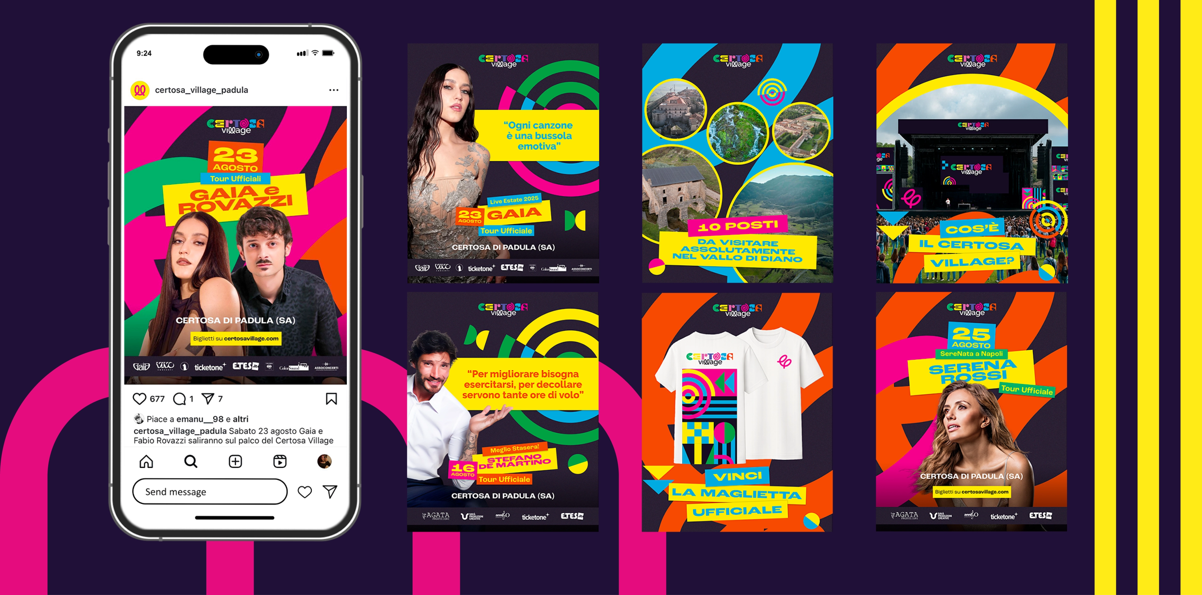Partendo da un mood preesistente, abbiamo sviluppato un’identità visiva completa e coerente, declinata su tutti gli strumenti necessari a un festival. Sono stati realizzati design per inviti, badge, ticket, mappe e materiali di segnaletica, oltre a supporti di comunicazione come roll-up, cartelloni e locandine. Anche oggetti come bicchieri, sottobicchieri e t-shirt sono stati progettati a livello grafico, rafforzando l’impatto visivo dell’evento e dando una dimensione tangibile alla brand identity. Ogni elemento è stato concepito per rendere il Village immediatamente riconoscibile e memorabile.