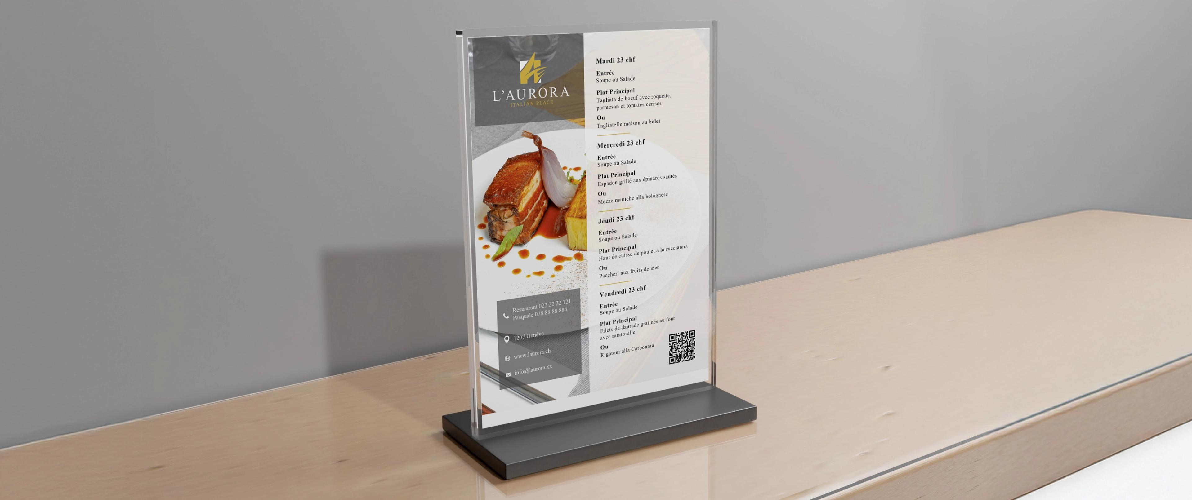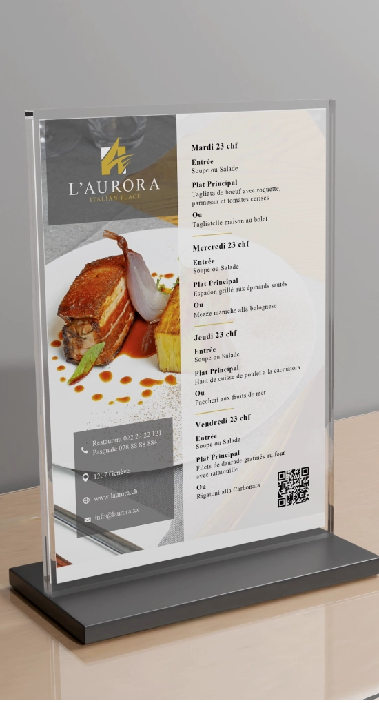 Il lavoro sull'identità visiva ha raccolto la tradizione italiana e l’ha filtrata attraverso l’eleganza moderna dello scenario genevano. Il nuovo Brand Identity è costruito su segni grafici calibrati, colori che evocano sapori autentici e un logo che riflette equilibrio tra contemporaneità e calore. Coordinato visivo applicato a elementi distintivi — dal cappello da chef al biglietto da visita — riscrive l’immagine del ristorante come sintesi di gusto, ospitalità e stile.