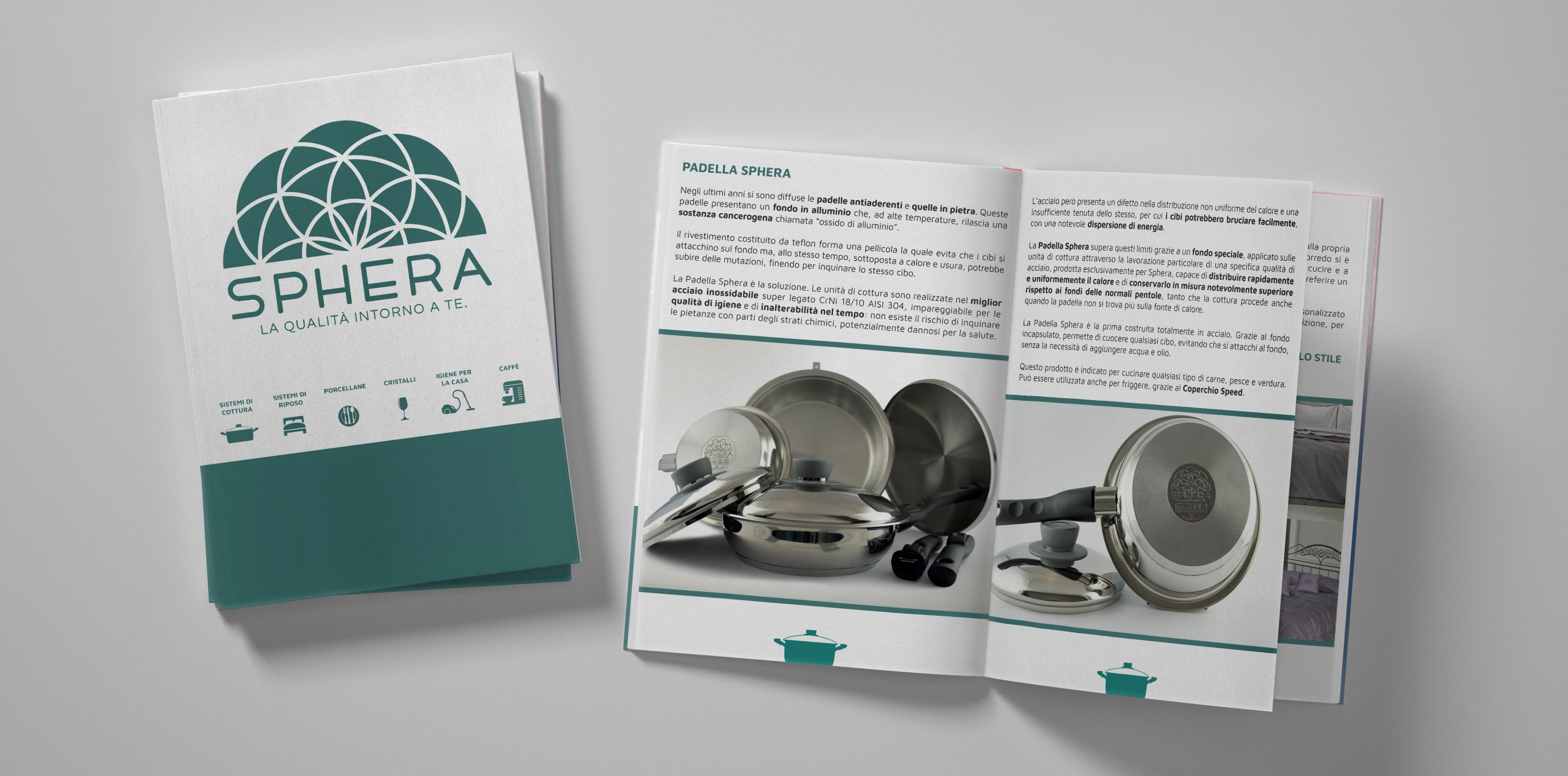 Il catalogo è stato progettato per raccontare la doppia anima dell’azienda: sistemi di cottura e sistemi di riposo. Impaginazione chiara, fotografie pulite e schede tecniche essenziali guidano la consultazione. La padella, con incisione personalizzata del brand, diventa icona della linea cooking, mentre accessori come profumatore per ambienti e presina rafforzano il racconto del benessere domestico. Ogni pagina restituisce l’equilibrio tra rigore tecnico e vicinanza al vissuto quotidiano.