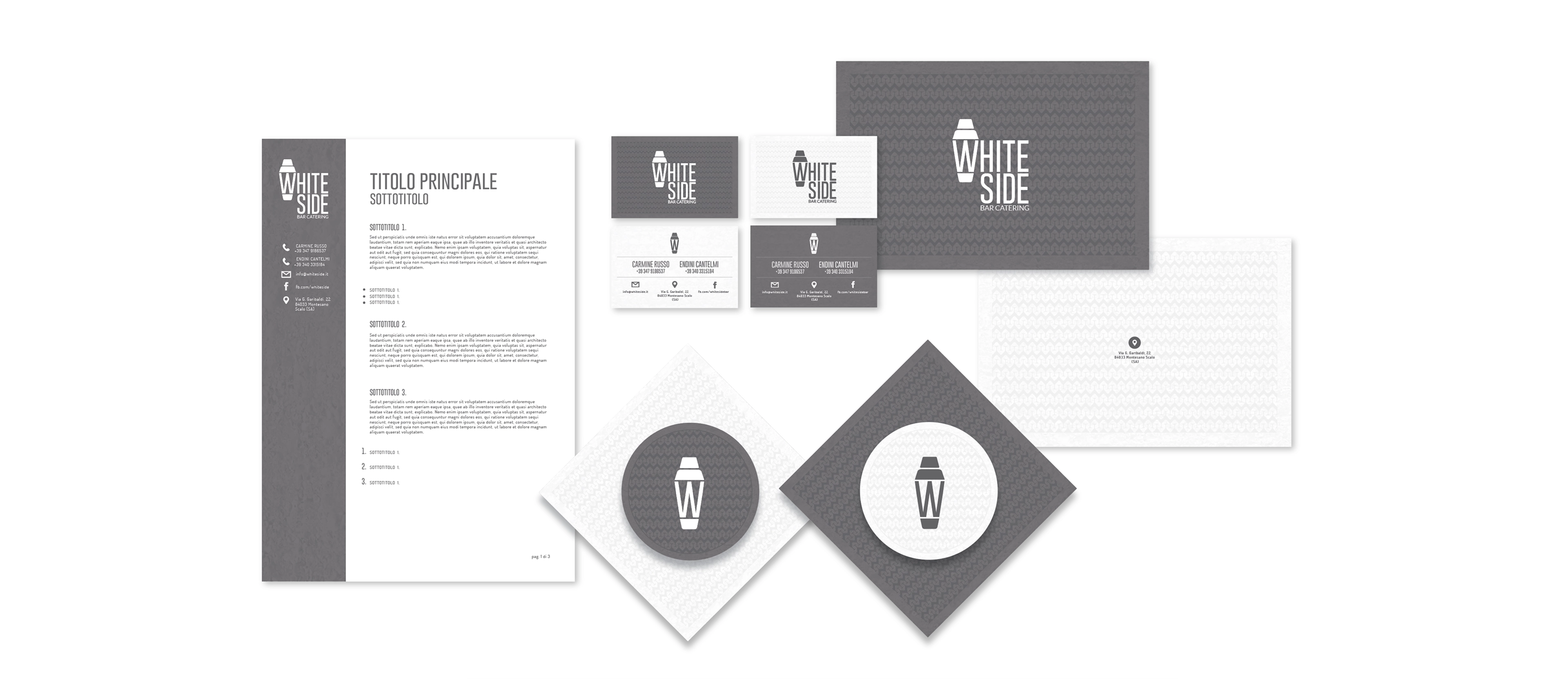 White Side’s visual identity merges elegance, minimalism, and attention to detail—reflecting the essence of its tailored service. The logo, sleek and modern, communicates refinement and professionalism through clean typography and subtle design. White, the brand’s signature color, symbolizes purity, versatility, and simplicity. The "W" integrated into the shaker illustration evokes movement and fluidity. This identity expresses exclusivity and precision, adapting seamlessly to any event while making the brand instantly recognizable.